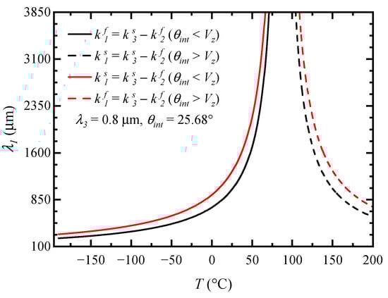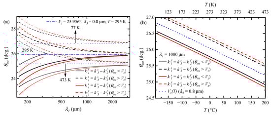 We have calculated temperature-tuning curves for the types of interactions involving PM in the xz plane. The dependence of the PM angles on λ1 is shown in Figure 7a. The semi-transparent curves correspond to PM at the LN temperature and 473 K (200 °C). These curves are again pairwise symmetrical with respect to the Vz angle and follow it upon heating. The Vz changes from 26.8° to 25.2° when the crystal is heated from 77 K to 473 K. Figure 7b represents these changes at the wavelength of λ3 = 0.8 µm (dashed blue curve) and the corresponding temperature shift of the PM curves presented for the fixed signal wavelength at λ1 = 1000 µm.