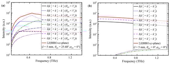The total intensity of the THz-generated spectra for the PM cut crystal (Figure 9a) shows two peaks corresponding to the PM interactions and a broad band substrate caused by optical rectification. The simulated intensities in these spectra are mostly limited by the effective lengths of the sample. In the case of PM interactions, the sample length limits the intensity, and in the case of optical rectification, the coherence length limits it. It is interesting to note that our calculations show that the total intensity of optical rectification in the x-cut sample is only one order of magnitude lower than the intensity of PM interaction in the PM cut crystal. Taking into account the high values of its nonlinear coefficients, it renders BIBO as one of the most prospective crystals of the borate family for phase- and non-phase-matched THz generation. The FOM for THz DFG in the BIBO crystal is estimated to be 1.5 times greater than that of the β-BBO crystal and almost 75 times greater than that of the LBO crystal.