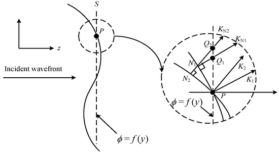 As shown in Figure 1, the incident light is incident along the z-axis in the normal direction, and the entire wave surface is distributed in the XOY plane. The wavefront measuring plane S is perpendicular to the z-axis, and the phase-distribution function of the incident light at the measuring line position is . Owing to the phase distortion of the wavefront, there is a phase difference between point P on the wave surface and the surrounding adjacent position.