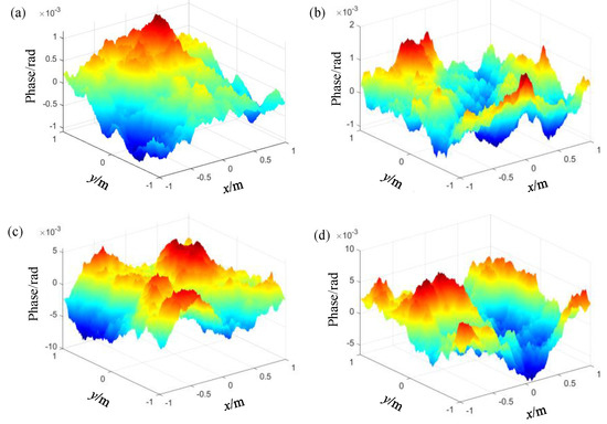 The outer turbulence scale L0 = 5 m, inner turbulence scale l0 = 0.1 m, waist radius = 5 mm, and atmospheric refractive index structure constant = 1 × 10−18 m−2/3. Figure 2 shows the simulation results of the wavefront phase distortion of Gaussian beams with 1550 nm, 850 nm, 632.8 nm, and 530 nm wavelengths after transmission in the same atmospheric channel, with transmission distance L = 10 km.