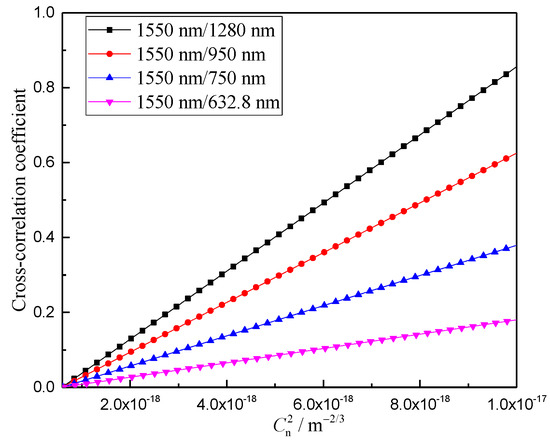 Figure 6 shows the variation curve of the correlation number of the arrival angle fluctuations of Gaussian beams of different wavelengths with the atmospheric turbulence intensity. It can be seen from Figure 6 that the correlation number between the arrival angle fluctuations of the Gaussian beams of different wavelengths gradually increases with the decrease in the atmospheric refractive index structure constant. The smaller the wavelength difference between the beacon and signal lights, the larger the cross-correlation coefficient between the corresponding arrival angle fluctuations of beams of different wavelengths. This indicates that the distortion information between the arrival angle fluctuations of different wavelengths has a higher consistency.