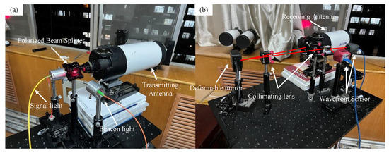 Experimental optical path. (a) Transmitting end. (b) Receiving end.