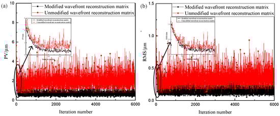 Figure 11 shows the variation curves of the signal wavefront peak-to-valley (PV) and wavefront root mean square (RMS) during the experiment. Table 2 lists the PV and RMS values of the signal wavefront before and after the experiment. Considering Figure 11 and Table 2, when the beacon optical wavefront reconstruction matrix was directly used as the signal optical wavefront reconstruction matrix to correct the signal optical wavefront distortion, the signal optical wavefront PV and RMS values converged slowly during the correction process and fluctuated significantly after convergence.