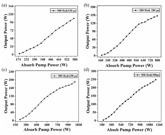 Laser output power versus absorbed pump power. (a) 500 Hz and 150 μs; (b) 500 Hz and 200 μs; (c) 500 Hz and 250 μs; (d) 500 Hz and 300 μs.
