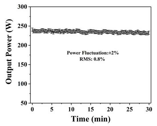 For the output power of 248 W, the power fluctuation is measured and shown in Figure 4. The average output power of the laser in 30 min is recorded by a power meter, and the power fluctuation is measured to be ±2%. As the measurement time increases, the laser output power decreases linearly. The reason for this phenomenon is that during the operation of the laser, the mirror holder of the resonant cavity continuously absorbs stray light, causing the holder to heat up and resulting in a slight decrease in laser output power. By optimizing the mirror holder structure in the future, the cooling and heat dissipation effect can be helpful to reduce the impact of temperature on it.