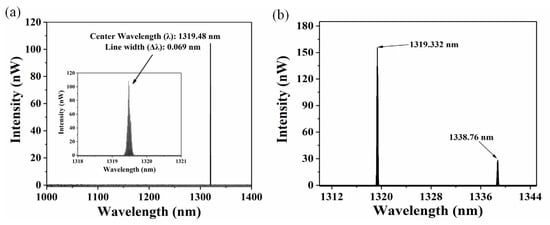 In addition, the laser output wavelength is detected by a spectrometer (Yokogawa (Tokyo, Japan), AQ6370D). Figure 5a,b depict the measured spectra at the average output power of 210 W and 248 W, respectively. The spectral property of the output beam is scanned and analyzed from 1000 nm to 1400 nm. As it can be seen from Figure 5a, we obtain 1319 nm QCW laser operation with a single wavelength when the output power is below 210 W and the subfigure in Figure 5a represents the narrow-range spectral shape captured at the single wavelength, whilst increasing the pump power further causes the 1338 nm wavelength to oscillate, as shown in Figure 5b. This is because the laser gain medium has two strong transitions in the 1.3 μm region from the 4F3/2 to the 4I13/2 manifold which have almost the same stimulated emission cross section. Thus, the laser output typically contains both wavelengths. One is the R2 → X1 transition at 1319 nm and the other is the R2 → X3 line at 1338 nm. We can further reduce the reflectivity of the cavity mirrors (M3 and M4) at 1338 nm to suppress its oscillation [].