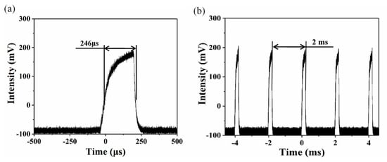 When the laser operates at the average output power of 210 W, the output pulse duration and the pulse profile are detected by a photodetector and a digital oscilloscope (Tektronix (Beaverton, OR, USA), DPO7354). As depicted in Figure 6a,b, the output pulse repetition rate and the pulse width are 500 Hz and 246 μs, respectively. The pulse waveform is smooth, which indicates that the power extraction is sufficient and there is no self-excitation in the 1319 nm InnoSlab laser.