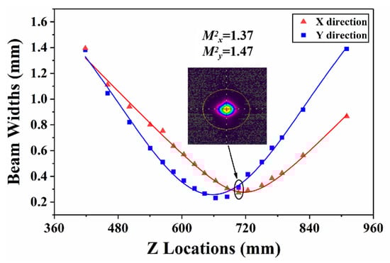 Next, for the average output power of 210 W, the two-dimensional profile of the laser beam is measured by a beam quality analyzer (Spiricon, M2-200), as shown in Figure 7. The beam quality factors of M2 with the method of 4-sigma are 1.37 and 1.47 in the horizontal and vertical directions, respectively.