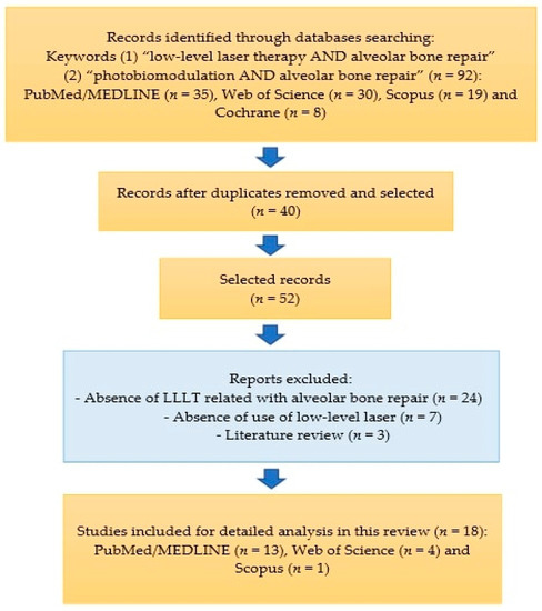 The studies that presented a title and abstract related to the chosen topic were initially selected based on the focus of this review: low-level laser therapy and photobiomodulation, as used in the alveolar bone repair process. The next step used was to exclude duplicated articles in the databases consulted and also to remove studies that did not follow the eligibility criteria through careful reading of the texts. This step was carried out paying special attention to the methodology used in the study, ensuring that the procedures used were, in fact, related to the theme proposed here.