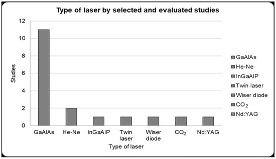 From the studies selected for detailed, we can see that eleven studies used a gallium–aluminum–arsenide laser (GaAlAs), two used helium–neon (He-Ne), one used indium gallium aluminum phosphorus (InGaAlP); one used a twin laser, one used a Wiser wireless diode laser, one used a CO2 laser and one used neodymium-doped yttrium aluminum garnet (Nd;YAG) (Figure 2).