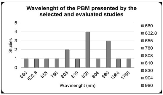 In the photobiomodulation protocols of the selected studies, when the wavelengths were analyzed the most used was 830 nm in four studies. Then, the next most was 980 nm in three studies; 808 nm in two studies; and 660 nm, 632.8 nm, 780 nm, 810 nm, 904 nm, 1064 nm and 1780 nm with one study each (Figure 3).