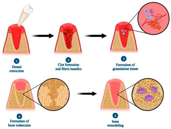 Scheme illustrating the steps of alveolar bone repair after tooth extraction. Briefly, the repair process is characterized initially by the formation of the clot and fibrin bundles, followed by the proliferation of fibroblasts, blood capillaries and inflammatory cells resulting in granulation tissue. In sequence, there is an increase in the amount of osteoblasts at the site, producing bone trabeculae that replace the granulation tissue. Finally, there is a gradual decrease in intertrabecular spaces in the process of bone remodeling, resulting in repaired bone tissue. Created with BioRender.com (accessed on 6 April 2023).