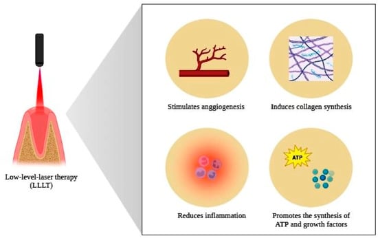This property on tissue repair is due to factors such as the stimulation of ATP production, the activation of transcription factors, the activation of genes responsible for the synthesis of growth factors, the inhibition of factors responsible for cell death, the attenuation of the inflammatory process resulting from the extraction and the promotion of greater blood supply to the site to be repaired [91,92] (Figure 5).