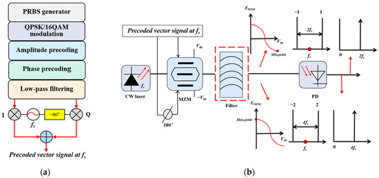 Figure 1 shows a schematic diagram of the photonic multifrequency vector mm-wave signal scheme generated using a single dual-arm MZM. As shown in Figure 1a, 16 QAM or QPSK modulation format precoded vector signals with frequency fs are realized by the MATLAB program. First, the pseudo-random binary sequence (PRBS) is vector mapped, then it is phase precoded and amplitude precoded, which is followed by the application of a low-pass filter, and finally, the vector signal is upconverted to the RF domain through cosine and sine functions, whose frequency is fs.