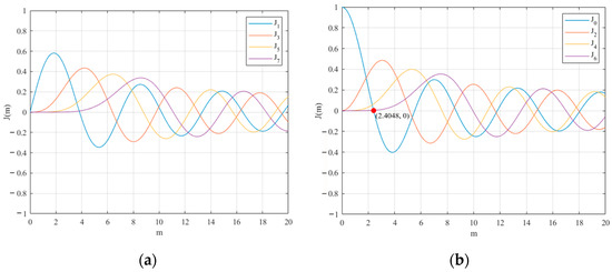 The first-kind Bessel function curve. (a) The function curve of the first order, third order, fifth order, and seventh order; (b) the function curve of the zeroth order, second order, fourth order, and sixth order.