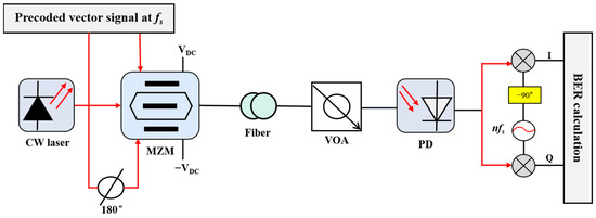 The scheme was intended to generate a PRBS with a symbol length of 212 and map it to QPSK at the MATLAB end with a frequency of fs. In small-signal mode, the DC voltage bias and driving voltage were changed—that is, MZM worked at the minimum bias point—and positive and negative second-order sidebands could be obtained. Next, the MZM output signal generated a 4 QPSK vector mm-wave signal by beating the frequency in a PD detector, obtaining the corresponding quadrupling frequency signal. Before the signal entered the PD, a VOA was utilized to control the received signal optical power. Finally, the BER was calculated offline using MATLAB software 2016b.