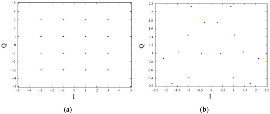 16 QAM constellation diagram. (a) 16 QAM constellation diagram before precoding; (b) 16 QAM constellation diagram after precoding.