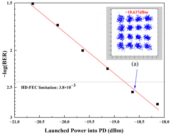 To obtain the simulation results, the generated 4-Gbaud 76 GHz 16 QAM vector signal was transmitted through 10 km of optical fiber. When the launched power is greater than −18.637 dBm, its BER is less than 3.8 × 10−3. When the launched power value is −18.637 dBm, its corresponding recovery constellation is shown in Figure 7a with good performance.