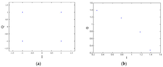 Constellation diagrams from before and after QPSK precoding are shown in Figure 8. Figure 8a represents a standard QPSK constellation diagram, and Figure 8b represents the constellation diagram after the quadruple-frequency precoding of standard QPSK.