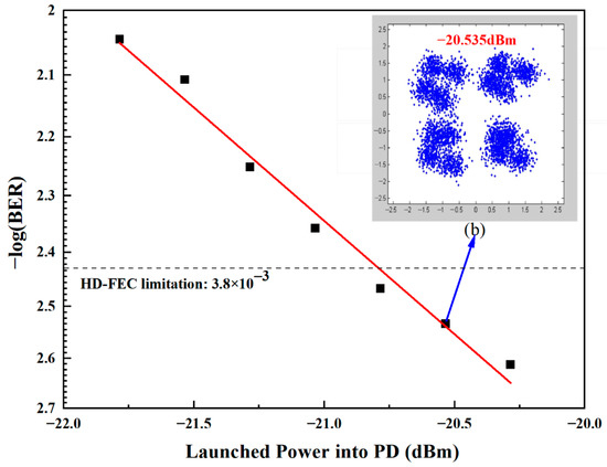 For simulation testing, the generated 4-Gbaud 76 GHz QPSK vector signal was transmitted through optical fiber for 12 km. When the launched power is greater than −20.535 dBm, its BER is less than 3.8 × 10−3. When the launched optical power is −20.535 dBm, its corresponding recovery constellation is shown in Figure 10b with good performance.