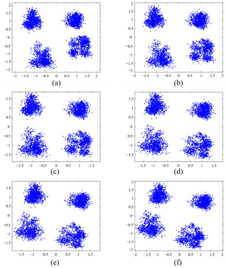 We observed the signal constellation by changing the value of the phase factor. When the phase factor changes from 3.6 to 4.1, the resulting constellation is shown in Figure 11. The input power of the PD was −15.803 dBm. From Figure 11e, it can be seen that there is phase asymmetry in the constellation, and the constellation points are phase shifted, which increases the BER of system. It can be seen that, compared to other phase factors, when the phase factor is adjusted to 3.8, the phase of the constellation points is uniformly and symmetrically distributed.