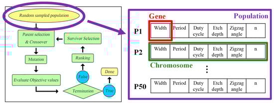 As discussed above, there are many DOFs during the design of the SiPh mode converter, including the waveguide width, length, period, zigzag angle, etch depth, duty cycle, etc., therefore an optimization algorithm, namely GA, is employed []. The GA optimization is a kind of heuristic optimization algorithm, and its idea comes from biological evolution. The parents pass genes to the offspring through inheritance, and offspring will have small mutations after receiving the genes. Then, these offspring will pass the genes to the next generation in the same way. Through such evolution, the optimized parameters of the device can be obtained.
