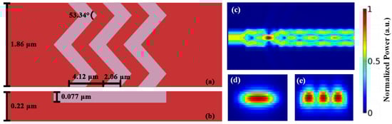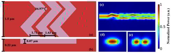 Besides the TE0 to TE1 mode conversion, we also illustrate that the proposed periodic zigzag structure and the GA optimization can also support higher-order mode conversion. For brevity, we only describe the TE0 to TE2 mode conversion as illustrated in Figure 4. The GA optimized periodic zigzag structured mode converter has the waveguide width and period number of 1.86 μm and 3, respectively. The period, duty cycle, etch depth and zigzag angle are 4.12 μm, 0.5, 0.077 μm and 53.34° respectively. These parameters of the GA optimized TE0 to TE2 zigzag periodic structure mode converter are also listed in Table 2 and illustrated in Figure 4a,b. Figure 4c shows the FDTD simulation result of the periodic zigzag structured mode converter. The TE0 mode can be successfully converted to TE2 mode with a high transmission of 91.2% and low loss of <1 dB at the transmission wavelength of 1550 nm. The cross sections of the input TE0 mode and the output TE2 mode are illustrated in Figure 4d and Figure 4e, respectively.