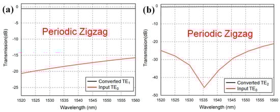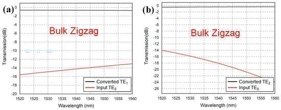 Figure 8a,b show the simulated mode conversion efficiencies between the target mode and the input mode of the TE0 to TE1 and the TE0 to TE2 bulk zigzag structured mode converters, respectively. The evaluation is performed in the wavelength window from 1520 nm to 1560 nm. For the TE0 to TE1 and TE0 to TE2 periodic zigzag structured mode converters, the mode extinction ratios are >12 dB and >14 dB, respectively, in the whole 40 nm wavelength range.