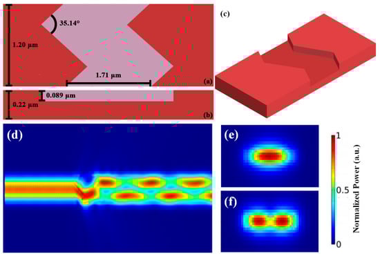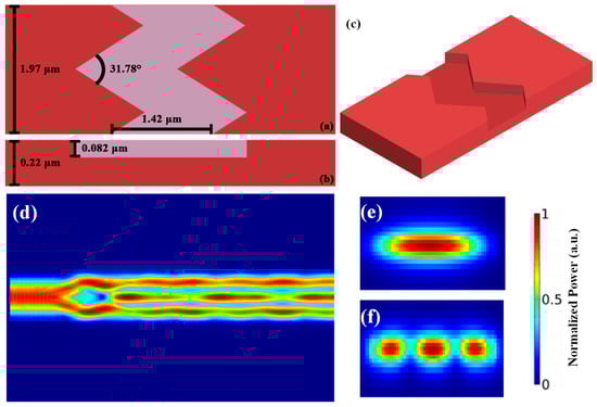 Similarly, we also perform the TE0 to TE2 mode conversion. There are also four parameters of the GA optimized TE0 to TE2 bulk periodic structured mode converter which are listed in Table 4 and illustrated in Figure 7a,b. The 3-D schematic of the bulk structure is shown in Figure 7c. The waveguide width, bulk length, etch depth and zigzag angle are 1.97 μm, 1.42 μm, 0.082 μm and 31.78°, respectively. Figure 7d shows the FDTD simulation result of the bulk zigzag structured mode converter. The TE0 mode can be successfully converted to TE2 mode with a high transmission of 92.3% and low loss of 0.3 dB at the transmission wavelength of 1550 nm. The cross sections of the input TE0 mode and the output TE2 mode are illustrated in Figure 7e and Figure 7f, respectively.