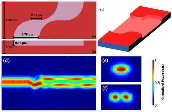 Ref. [] reviews different SiPh-based MDM mode multiplexers (mux) and de-multiplexers (demux). They include multimode interference (MMI) couplers [], asymmetric Y-junctions [] and asymmetric directional couplers (ADCs) [,,]. The first type is the MMI-based mode mux/demux. An MMI consists of some input/output waveguides and an interference region, in which the multimode interference is excited by the incident optical signal producing a series of self-images. The desired output phases and modes can be obtained by designing the MMI length, width and the input/output waveguide positions. The disadvantage of the MMI-based mode mux/demux is the relatively large device size in order to achieve the required self-imaging in the interference region. The second type is the asymmetric Y-junction-based mode mux/demux. The incident optical signal from a single arm in the asymmetric Y-junction is coupled to a higher-order mode with the closest effective index. As illustrated in a two-channel asymmetric Y-junction reported in [], the input TM0 mode in the input narrow arm excites the first-order TM1 mode in the bus region. However, the asymmetric Y-junction is sensitive to the structural parameters, particularly the divergence angle in the Y-junction. The third type is the ADC-based mode mux/demux. An ADC consists of a narrow access waveguide (for the fundamental TE0 mode transmission) and a wide bus waveguide (for the high-order mode transmissions). When the widths of the access waveguide and base waveguide achieve the same effective refractive index, the phase matching condition is fulfilled. In this condition, mode conversion between the access and bus waveguides can be performed. It was shown that reducing the separation between the access and bus waveguides can effectively reduce the device size []; however, a long coupling length is still needed for effective mode conversion.