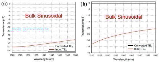 Figure 11a,b show the simulated mode conversion efficiencies (i.e., extinction ratio) between the target mode and the input mode of the TE0 to TE1 and the TE0 to TE2 bulk sinusoidal structured mode converters, respectively. The evaluation is performed in the wavelength window from 1520 nm to 1560 nm. For the TE0 to TE1 and TE0 to TE2 periodic sinusoidal structured mode converters, the mode extinction ratios are >18 dB and >20 dB, respectively, in the whole 40 nm wavelength range.