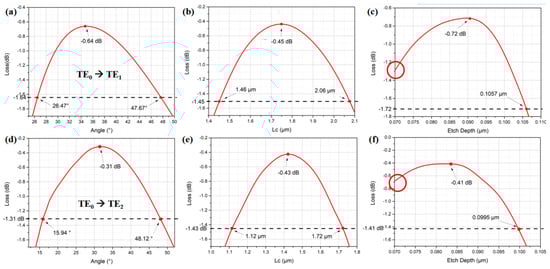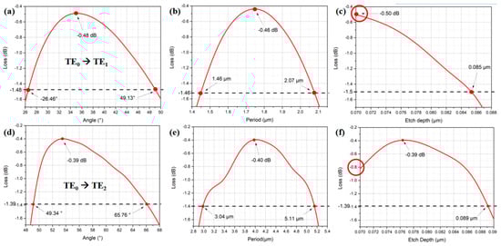 We also analyze the parameter tolerances for the six mode converters. Figure 12a–f show the GA simulated loss against zigzag angle, period and etch depth for the TE0 to TE1 and the TE0 to TE2 periodic zigzag mode converters, respectively. It is worth noting that when a particular parameter varies around its optimized value, other parameters are fixed using the optimized values listed in Table 1 and Table 2. Moreover, Figure 13a–f show the GA simulated loss against zigzag angle, bulk length and etch depth for the TE0 to TE1 and the TE0 to TE2 bulk zigzag structured mode converters, respectively.