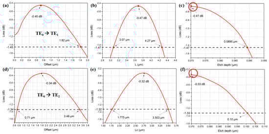 Simulated TE0 to TE1 bulk sinusoidal structured mode converter loss against (a) straight wavelength length (i.e., offset), (b) bulk length, (c) etch depth; TE0 to TE2 bulk sinusoidal structured mode converter loss against (d) straight wavelength length (i.e., offset), (e) bulk length, (f) etch depth.