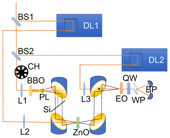 The experimental setup is a standard Optical Pump/THz Probe setup, where the THz pulses are provided by four-wave mixing in air [11,12]. Figure 1 illustrates the schematic representation of the experimental setup. A regenerative amplified femtosecond laser system (Coherent Legend) is utilized, emitting optical pulses with a central wavelength of 800 nm and a duration of 35 fs. The laser operates at a power of 3.8 W with a repetition rate of 1 kHz. To generate and detect THz radiation, the laser beam is split into two portions using a 5–95% beamsplitter. The stronger portion serves as the pump for generating THz radiation, while the weaker portion acts as the probe for detecting the THz radiation.