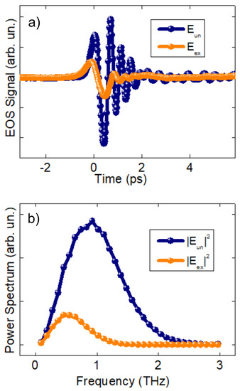Panel (a): EOS Signal of unexcited (blue dots) and excited (orange dots) transmitted THz electric fields 120 ps after the arrival of the optical Pump pulse (40 mJ/cm). Panel (b): Power spectra of the same waveforms.