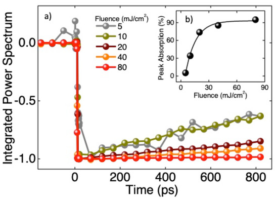 Figure 3b shows the percentage of maximum absorption of each curve, which is obtained a few picoseconds after pumping. The behavior is strongly saturated, showing that the excitation has reached a point at which the sample has an almost metallic behavior and absorbs/reflects more than 90% of the THz radiation. According to ref. [10], we analyzed our THz spectra in order to extract the photoinduced changes in the relative-permittivity function under the assumption of homogeneous spatial excitation of the sample and for delay times much longer than the THz pulse duration itself (∼1 ps). We have analyzed the results in terms of a simple linear relationship between the photo-induced relative-permittivity variation and the measured ratio of excited and unexcited waveforms (Equation (6) in Ref. [10]):