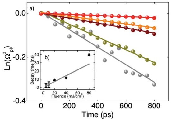Panel (a): the natural logarithm of the normalized squared plasma resonance is shown to demonstrate that the decay is well approximated by a single exponential curve (solid line). The colors follow the same legend as in Figure 3a. Panel (b): the value of each measured exponential decay time (black dots) is shown as a function of the Pump fluence and the behavior is empirically approximated by a linear best fit curve (grey solid line).