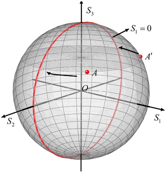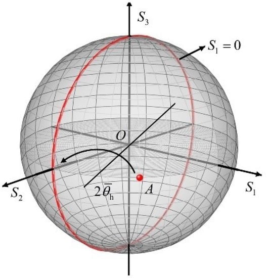 The DSP module is used to minimize the feedback signal by and adjust the azimuth of HWP. It can be seen from Equation (6) that should meet to be in order to keep it at the minimum value. Figure 3 illustrates the transition process of the SOP of the input LO through an HWP. are stokes parameters that can visually describe the SOP of light on the Poincare sphere. refers to the difference in intensity of the light after passing through the horizontal and vertical polarizers. is the difference in intensity of the light after passing through ±45° polarizers. is the difference in intensity of the light after passing through a quarter-wave-plate (QWP) and ±45° polarizers. From the perspective of Poincaré sphere, the control target is the ring . The SOP of input light can be assumed to be set at point A which will be rotated around the axis to reach the target ring.