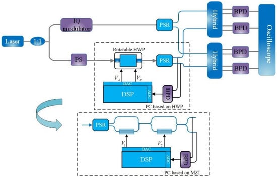 Waveplate-type polarization control structure. (polarization splitter–rotator (PSR), balanced photodetector (BPD), analog-to-digital conversion (ADC), and digital-to-analog conversion (DAC)).
