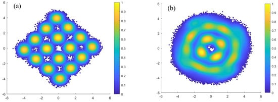 The laser generates light with a linear SOP, and arbitrary SOP change of the LO which has random power attenuation can be obtained after PS. Since LO and the modulated signal originate from the same laser, frequency offset compensation is not required in the DSP process, and the process of phase recovery can also be simplified. The power of these two output lights is equal, but the phase error between the controlled LO and signal changes slowly. Figure 8 shows the constellation plots for RSOP of 10 krad/s and 100 krad/s without carrier phase recovery (CPR), both under the condition that the LO is fully controlled to . It can be seen that the change rate of phase error increases with the increase in RSOP. To compensate for the tight phase error, we use simplified blind phase search (BPS) for CPR. It uses a fixed phase for phase compensation within a certain period of time. The fixed phase is updated periodically. Considering the mismatch length, the phase error can be compensated together with the phase error caused by the mismatch length.