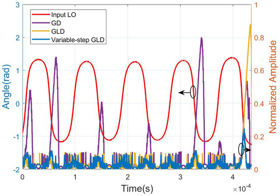 We also give the tracking process of the MZI structure employing the GD algorithm, GLD algorithm, and variable-step GLD algorithm under 18 krad/s. The azimuth of scrambled LO and the phase changes of the phase shifter under three algorithms are visual in Figure 10. Figure 11 accordingly expresses the tracking process of the feedback signal with these algorithms. From these figures, it is evident that the phase of MZI varies with the azimuth of input LO as in Equation (12), and the feedback signal remains stable. When the azimuth of LO changes rapidly, the variable phase cannot keep up with it. Furthermore, the updating direction is misjudged, leading to the bumpy of the feedback signal. The above situation is more probable to happen with GD and GLD algorithms. It can be seen that the feedback signal controlled by the variable-step GLD algorithm experiences the smallest bumpy, and the angle of the feedback signal tracks LO with higher accuracy. This observation suggests that the variable-step GLD algorithm exhibits the best tracking ability among the three algorithms.