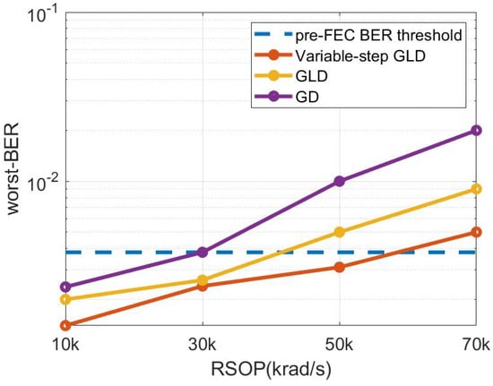 Figure 12 presents the measured worst-BER under different RSOP in different algorithms of HWP polarization control structure. The BER threshold before 7% overhead hard-decision forward error correction (HD-FEC) is used. As shown in the figure, the GD algorithm and GLD algorithm can control RSOP up to 30 krad/s, while the variable-step GLD algorithm can control the RSOP up to 50 krad/s under the pre-FEC BER threshold. Compared with the first two algorithms, the variable-step GLD algorithm effectively improves the tracking speed. It should be noted that phase drift and power fluctuations may slightly affect the tracking results.