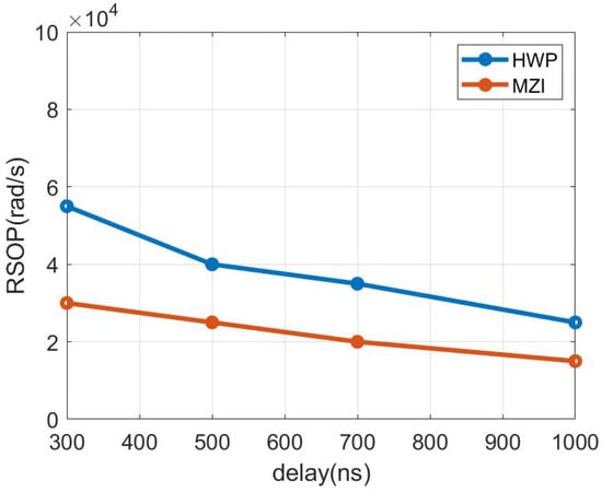 The tracking ability is not only related to the polarization control algorithm but also affected by the control loop bandwidth, DA/AD sampling rate, DSP processing rate, and other factors. The control loop bandwidth has a significant effect on the control speed. To show the relationship between the control loop conditions and tracking speed more clearly, we simulated the control situation under different loop delays and obtained the maximum controllable RSOP, as shown in Figure 15. As the loop delay becomes longer, the control capability of these control structures is also weakened. Increasing the bandwidth of the control loop can significantly improve its tracking capability. The tracking ability of the MZI structure is weaker than that of HWP structure under the same loop delay owing to the reset in MZI structure. To sum up, the hardware speed of MZI can be faster, but its control algorithm is more complex than that of HWP in the SHC system.