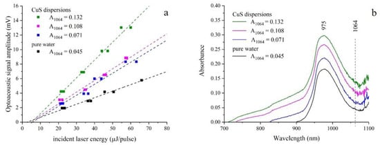 (a) Optoacoustic signal amplitudes (mV) of CuS dispersions plotted as a function of incident laser energy (μJ/pulse). Dashed lines represent a linear fitting function of the data. According to the legend, different colors refer to samples having the extinction values at 1064 nm shown in the extinction spectra (b). In black, the data referred to pure water are also reported. The vertical dashed line in (b) corresponds to the laser excitation wavelength. The extinction band of water with a maximum at 975 nm was not subtracted from the extinction spectra shown in this figure.