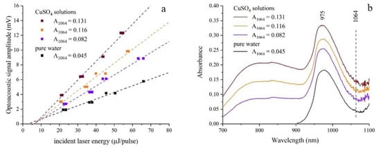 (a) Optoacoustic signal amplitudes (mV) of CuSO4 solutions plotted as a function of incident laser energy (μJ/pulse). Dashed lines represent a linear fitting function of the data. According to the legend, different colors refer to samples having the extinction values at 1064 nm shown in the extinction spectra (b). In black, the data referred to pure water are also reported. The vertical dashed line in (b) corresponds to the laser excitation wavelength. The extinction band of water with a maximum at 975 nm was not subtracted from the extinction spectra shown in this figure.