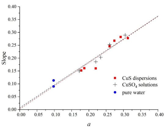 The PCE of CuS NPs could thus be evaluated by the analysis shown in Figure 4. For this purpose, the slopes of 14 fitting lines, including those shown in Figure 2a and Figure 3a, were plotted as a function of the absorption factor a. Within the experimental error, the plots of the signals of CuS NPs and those of the CuSO4 reference solutions resulted identically linear with absorption, having slopes S, respectively.