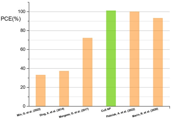 We propose that the present results are consistent with the previous investigations. Figure 5 presents a bar graph where the PCEs of various CuS nanosystems are contrasted. The method we present here has been previously applied to the determination of the PCE of CuS covellite nanoflakes []. In that case, PCE was significantly lower than unity, as it was 72% at 1064 nm excitation. We interpreted this result according to losses due to light scattering that are possibly negligible in the present case. This effect, in fact, is expected to be much larger for nanoflakes than for small-sized CuS NPs, because the size of the nanoflakes was several hundreds of nanometers. Light scattering is known to generally increase with NP size. In fact, it was reported that PCE was improved in various CuS nanosystems with reduced NP size [,]. On the other hand, the observed PCE values (37% [] and 32.9% []) leave an open question, namely, where has the >63% complementary heat disappeared? An application of our method to the same material systems would be a useful benchmark.