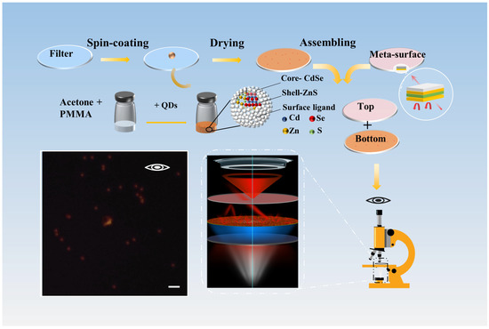 The CdSe/ZnS QDs + PMMA mixture was spin-coated onto the filter surface to form an optical frequency conversion layer capable of absorbing blue light in the 380–600 nm range and converting it to 620 nm red light. The optical meta-surface with a custom transmission angle spectrum was created from a multilayer dielectric film structure alternating high and low refractive index materials. As a result, the meta-surface reflects 620 nm light at small angles while letting it pass through at larger angles. The optical frequency conversion layer was combined with the optical meta-surface to produce a controlled-angle light cone. The slide is used for transparent bright-field microscopy, serving as a substitute for the bulky dark-field mirror and achieving high-contrast dark-field imaging even for 1-μm monodisperse polystyrene microspheres under LED illumination. Scale bars, 5 µm.