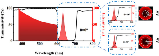 Light stop for dark-field microscope and dark-field condensers are often used to modulate the illumination angle to achieve the desired numerical aperture [23]. This can become complex as the numerical aperture increases. However, using metamaterials simplifies this process. One-dimensional photonic crystals, made up of high and low refractive index materials in a periodic arrangement, are a common form of metamaterials. This arrangement creates specific transmission and forbidden bands for electromagnetic waves, allowing for the creation of a transmission cone with a tailored angular spectrum. This technology has been utilized in various applications, such as bandpass filters [44], highly reflective mirrors [45,46], and dispersive mirrors [47]. In this study, we designed a multi-layer dielectric film with a customized angular spectrum that was coated on quartz glass (Figure 3a). Schematic of the multilayer structure and the layer-thickness profile are shown in Figure 3b. Dielectric films are built on the basis of multi-beam interference, with each layer having a thickness of several hundred nanometers. Through specific combinations, they can achieve enhanced transmission or reflection in specific wavelength ranges, exhibiting properties of metamaterials. The transmissivity characteristic of the meta-surface is shown in Figure 3c. It was designed to have a transmission band for large-angle light and a forbidden band for small-angle light, resulting in a large-angle light cone transmission similar to that of a dark-field condenser. The films were designed with Numerical Apertures (NA) of 0.65 for the peak wavelength of 620 nm. To make the dark-field imaging film widely compatible with various types of transmission microscopes, we proposed a composite structure that combines an optical frequency conversion structure with the film. The composite structure also includes a filter and QDs to convert the incident white light from a LED into outgoing light of 620 nm wavelength. In summary, when the LED light is incident vertically and passes through the composite slide, it first goes through the frequency conversion structure, then the multi-layer dielectric film, and finally is emitted at a controllable large angle. The design of the slide is split into two components that serve the purpose of optical frequency conversion and angle-selective transmission. (1) The optical frequency conversion layer consists of a filter and QDs material. The filter’s transmission band is for light in the wavelength range of 380–600 nm, and light in this band excites the QDs emitting layer. The QDs luminescent layer is mixed with a specific PMMA solution, spin-coated on the filter, and can convert light in the 380–600 nm wavelength range into 620 nm red light, which serves as the scattered light source for the sample. (2) The meta-surface of the multilayer dielectric film is made of high and low refractive index materials and has specific band gaps and transmission bands. The 620 nm red light emitted by the optical frequency conversion layer is directed toward the meta-surface at various angles. Light from small angles is hardly transmitted and reflected back to the optical frequency conversion layer, while light from the lower 600 nm band excites the QDs again, increasing the intensity of the light emitted from the QDs. A small portion of the remaining light passes through the optical frequency conversion layer, and the light from the QDs is adjusted to emit at a large angle, forming the illumination cone needed for dark-field imaging on the surface of the meta-surface slide.