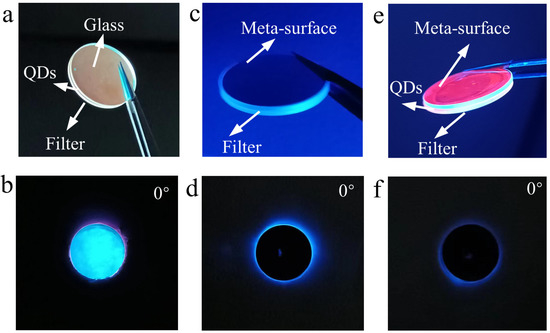 (a,b) Combination of the optical frequency conversion layer (filter + QDs) and blank slide (without the meta-surface). (c,d) Combination of the filter and meta-surface slide. (e,f) The complete structure, combination of optical frequency conversion layer (filter + QDs) and meta-surface slide.
